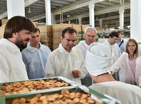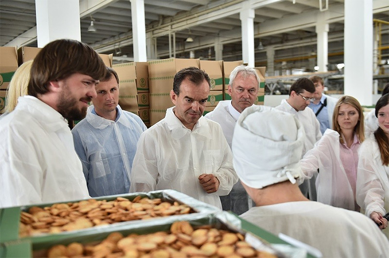 Вениамин Кондратьев попробовал продукцию с конвейера, оценил ее качество. Поговорил глава региона и с работниками предприятия.