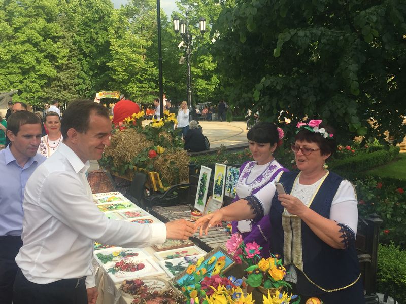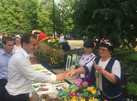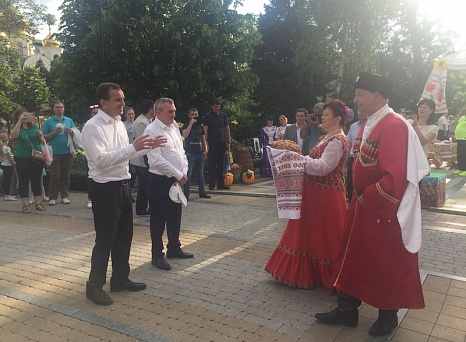 Глава администрации Краснодарского края Вениамин Кондратьев и председатель ЗСК Владимир Бекетов посетили все подворья и выставки. Хлебом-солью и песнями встречали губернатора "хозяин" с "хозяйкой" на Курганинском подворье. Вениамин Иванович пообщался с сельхозпроизводителями, мастерами-прикладниками, самодеятельными артистами Курганинского района и сказал: "Надо беречь народное творчество и дорожить кубанской культурой, дети и внуки должны говорить на русском языке, на кубанской балачке…". Наши артисты исполнили для дорогих гостей песню