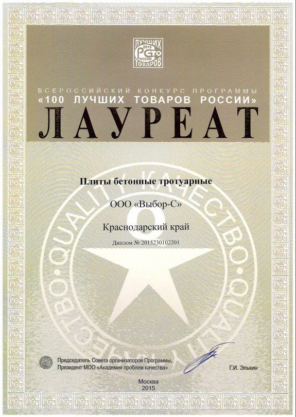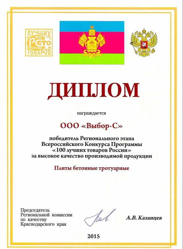 Награда "За высокое качество продукции" компании "Выбор" приятна не только нам, но и нашим клиентам, подтверждая правильность их выбора. Тротуарные плиты компании "Выбор" выпускаются по технологии полусухого вибропрессования, что является гарантией качества и долговечности. За счет использования в фактурном слое крупной гранитной крошки, натуральных природных камней и импортных красителей плитка "Выбор" считается по праву одной из лучших в России.
